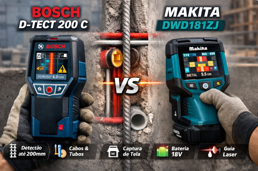 Se você procura um detector de metais para parede profissional para evitar perfurações acidentais em cabos, tubulações ou vergalhões, este comparativo técnico completo entre o Bosch D-TECT 200 C e o Makita DWD181ZJ vai ajudar você a decidir com segurança.